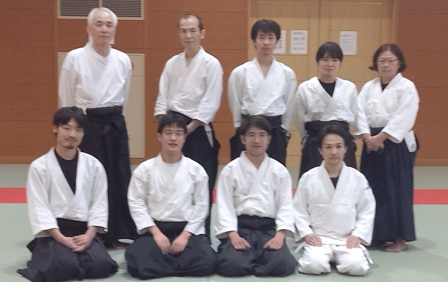 講習会では、先輩と組ませて頂き、軸を感じる柔らかな受けをしてくださるなかでの“取り”、技の理合いの輪郭が少し見えてくるような“受け”を通しての学びが沢山ありました。また、同世代の方々のとても力強い合気道に触れたことも新たな刺激となり、充実した時間を過ごすことができました。この講習会に滋賀県からは5名(下の写真)の参加。全国から沢山の同世代の方々が集まるなかに、同郷の人たちがおられたことの安堵とともに、滋賀県に合気道の同世代の方々がおられることの嬉しさを感じる機会にもなりました。